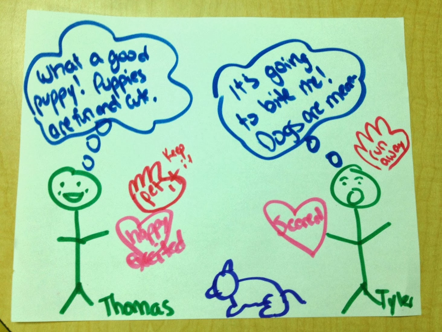 “Whoa. Check this out. These boys were the same age and saw the same dog but they felt very different feelings and did different things. Hm. Why do you think they felt so different? Do you think it could be their thoughts?”