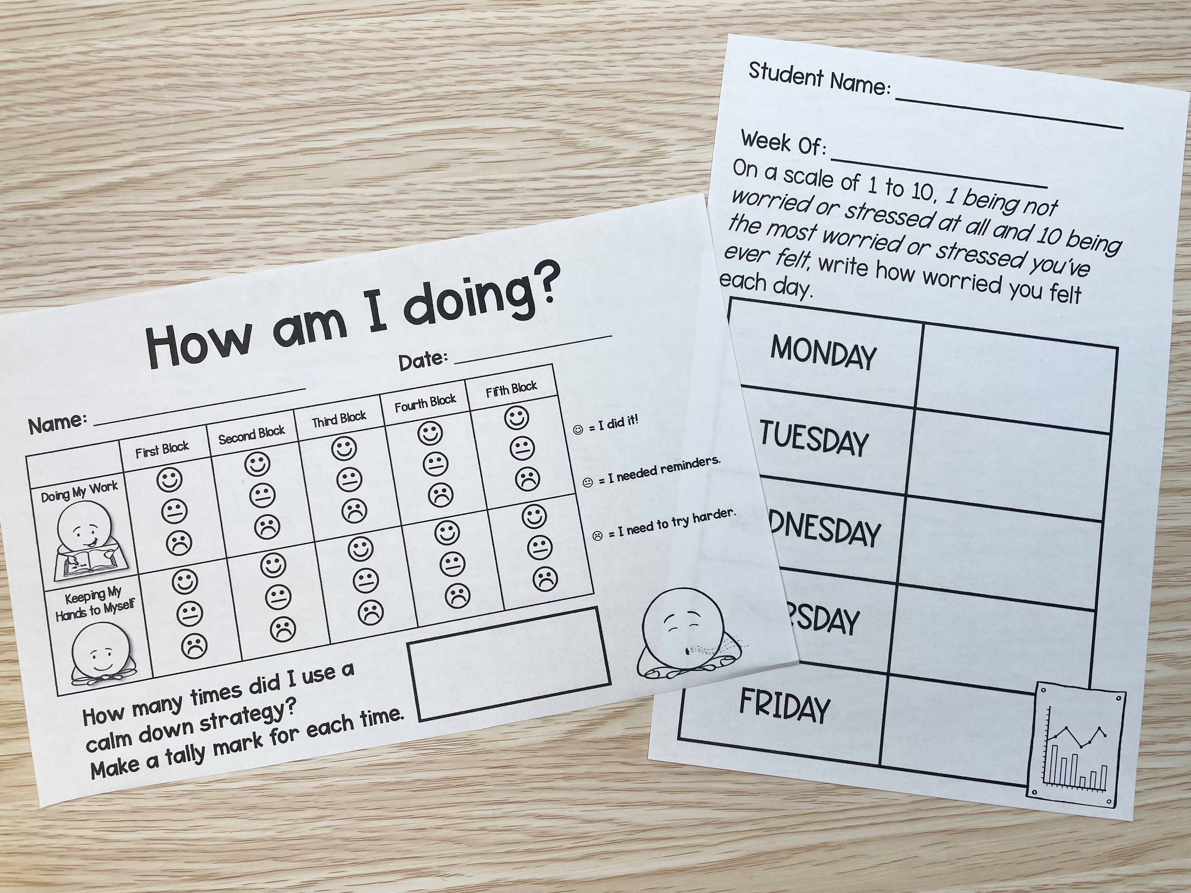 Self-monitoring is a form of reinforcement. It’s basically asking students to pay attention to their own symptoms or behaviors. This helps them to gain self-awareness and possibly set goals around their experience (whether it’s behavioral/choices or mood/symptoms). One example you see below is something a lot like a point sheet you’d use with check in/check out, looking at behaviors. Another example would just be a student monitoring their level of worries each day.